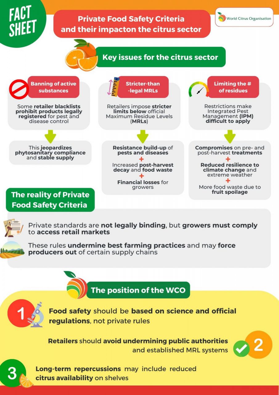 These key risks and challenges are highlighted in the WCO position paper “Private Food Safety Criteria and their impact on the citrus sector”, presented at Fruit Attraction in Madrid and published in three languages (English, Spanish, and French) for maximum outreach. The position paper highlights the following main points: